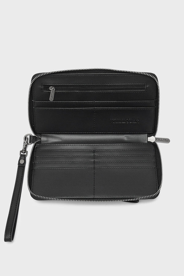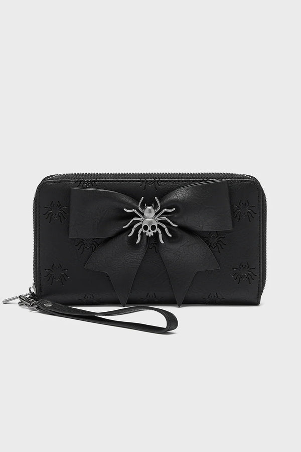 - Statement, all over custom embossed PU wallet. - Detachable wrist strap to use as clutch bag. - Zip fastening. - Bow detail, with custom spider hardware. - Internal card...