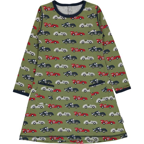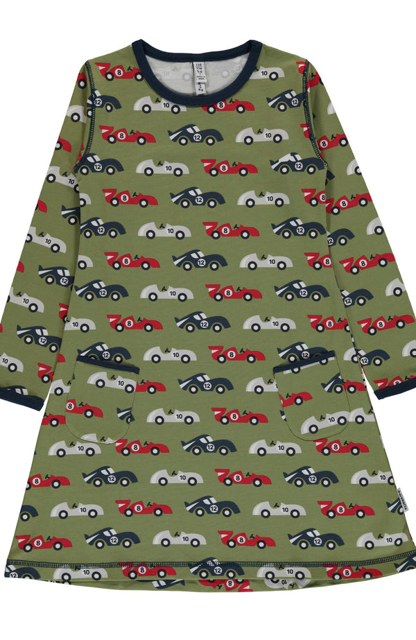 Classic Maxomorra Race Car Scandi repeat print featuring funky race cars on a khaki green background with a black trim Long-sleeved dress in soft cotton jersey with rounded, double-stitched side pockets Ribbed...